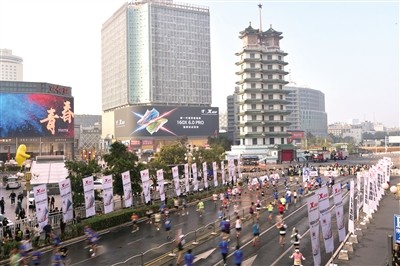 7:30,发令枪准时响起,选手们陆续从起点出发,奔跑在清晨的阳光下,随着时间的推移,由4万人组成的长跑队伍浩浩荡荡,像一条移动的巨龙,在郑州的街头蜿蜒伸展,构成了一幅壮丽的全民健身画卷。