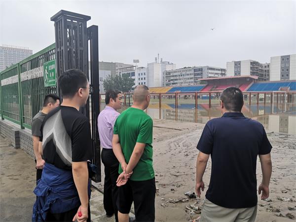 我校体育场的救灾工作得到了足球比分live 的大力支持和高度重视,局领导多次到体育场查看防汛抢险工作并进行现场指导,第一时间协调相关部门参与救灾工作,来自西安的义务抢险救援队与我校教职工经过三天的努力将一万余平方米的场地积水排干,随后管城区环卫中心派出了5辆大型洒水车,在体育场内全力进行排污清淤工作。